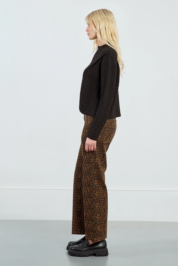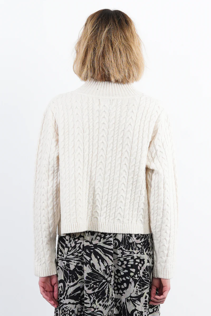 The Crossover Sweater brings a modern twist to a classic cable-knit design with its chic crisscross front and semi-stand-up collar. Finished with long sleeves and an asymmetrical cutout hem, it’s the perfect blend of cozy comfort and contemporary style