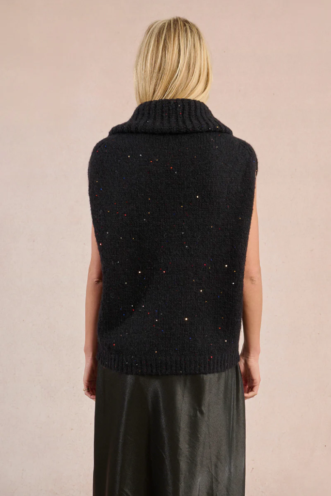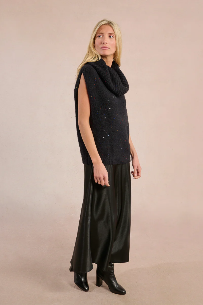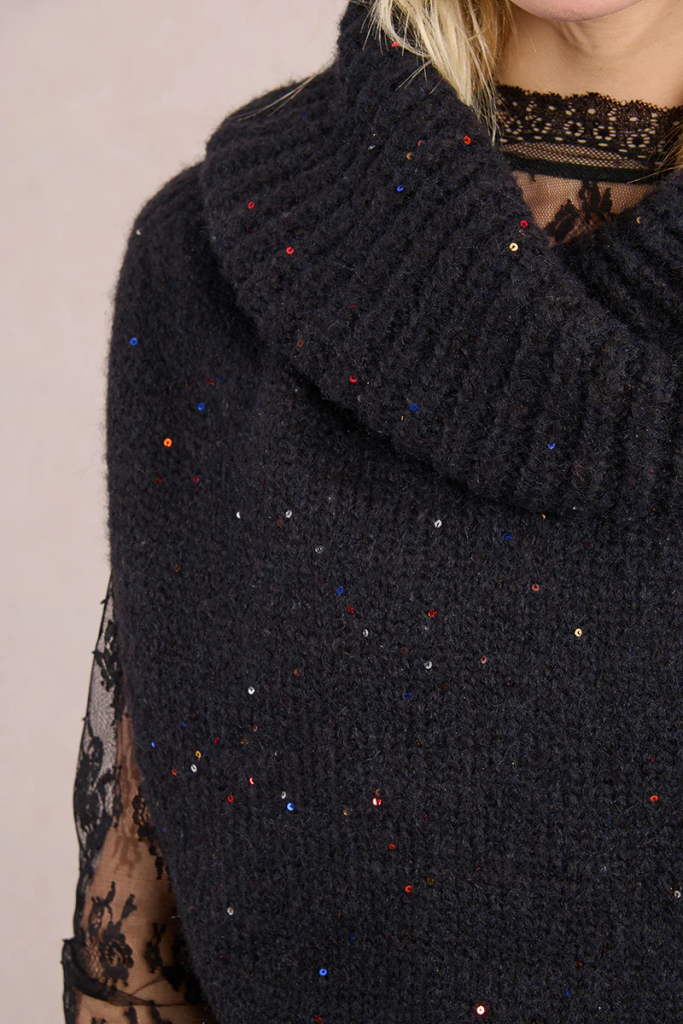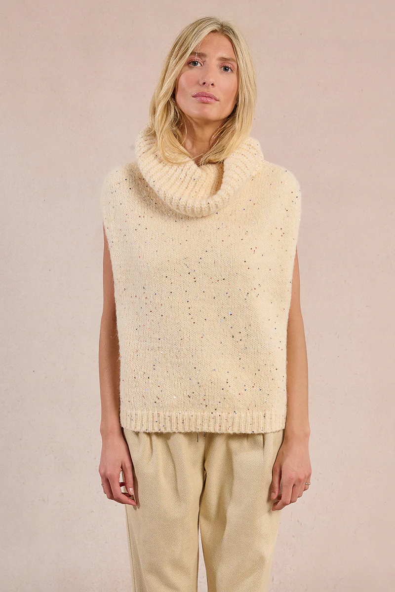 This knitted sleeveless sweater features a chic straight fit, wide turtleneck, and subtle sequin embellishments for a touch of sparkle. Crafted from a soft acrylic, polyamide, polyester, and wool blend, it’s the perfect piece to add effortless style and comfort to your wardrobe.
