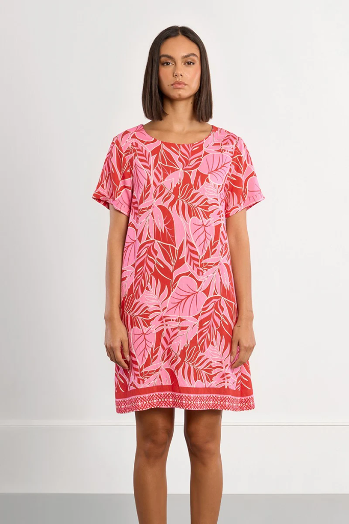 Fresh, vibrant, and effortlessly easy. This tropical print dress is designed for comfort and style, making it the perfect choice for sunny days and relaxed outings.