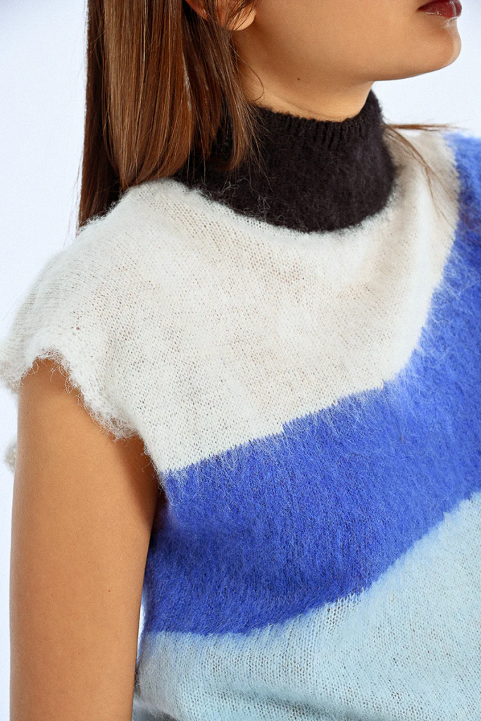 The Waves Sweater Blue Sleeveless features a modern stand-up collar and a clean, straight fit for effortless layering. Crafted in soft brushed mesh, it offers both comfort and contemporary edge in one versatile piece
