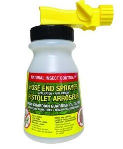 This hose-end sprayer provides a fan spray for quick coverage of large area of turf. The container can be filled with a wettable fertilizer or beneficial nematode concentrate and then connected to your hose for application. It provides up to 20 gallons of finished spray with fixed rate is 1-1.5 oz of fertilizer or nematodes per gallon. It is durable, chemical resistant and made of rustproof polymer
