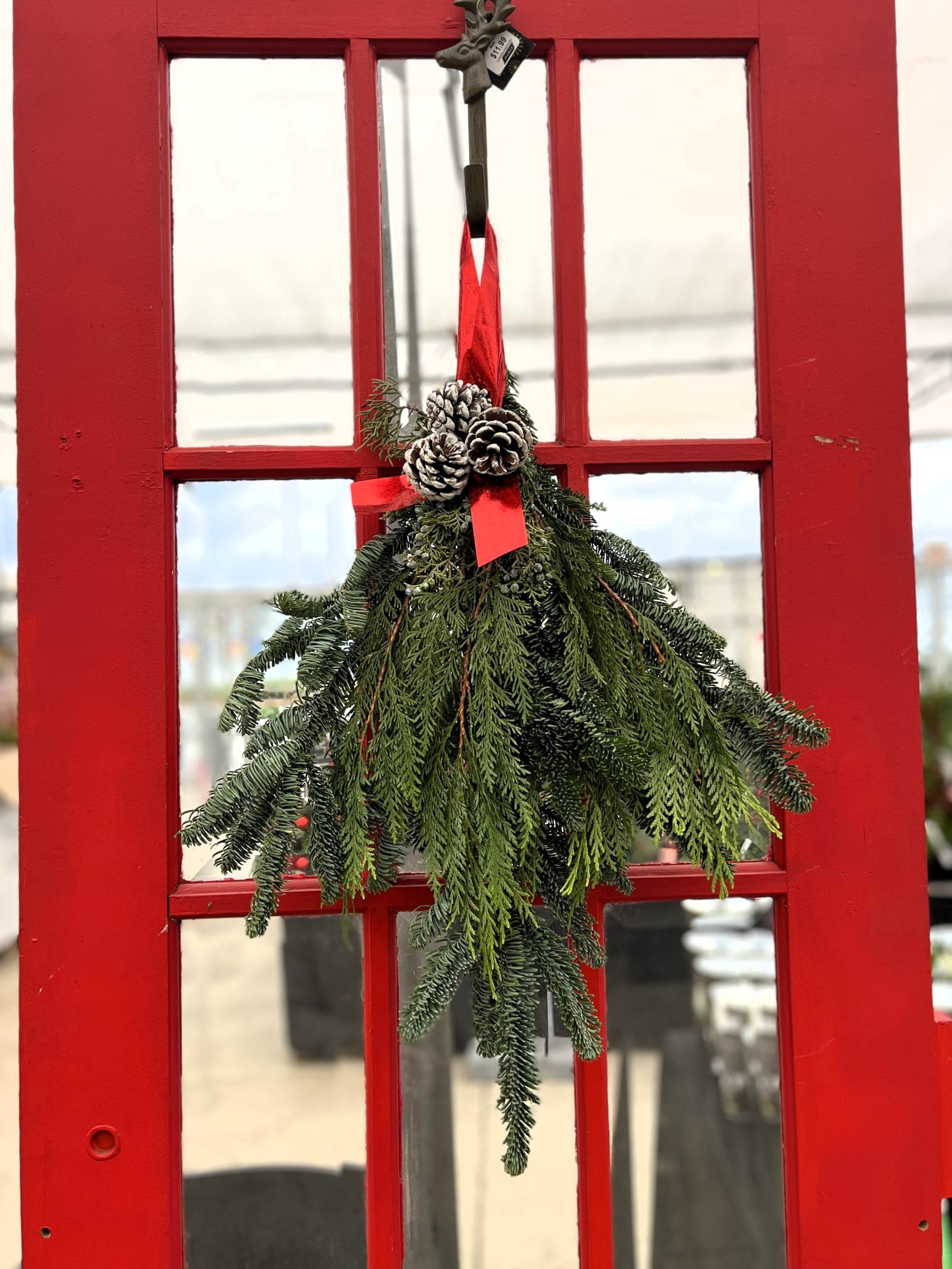 Noble Door Greeter – This simple fresh evergreen swag is a great little addition to a door or window. Mixed greens with pine cones hang from a red ribbon. Ready to hang.
