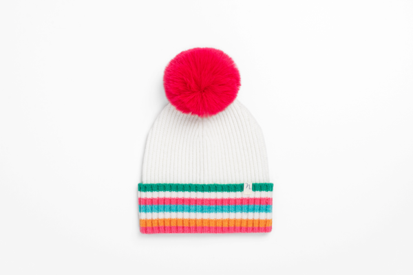 Faux Fur Pom. Turn Up Cuff. Woven Logo Label. Soft Knit Fabric. 36% Acrylic, 30% Nylon, 28% Polyester, 6% Wool. 8″H x 7.5″W.