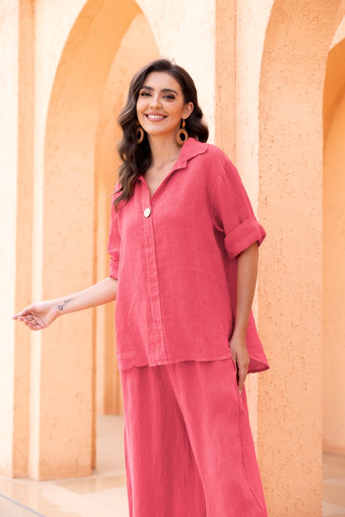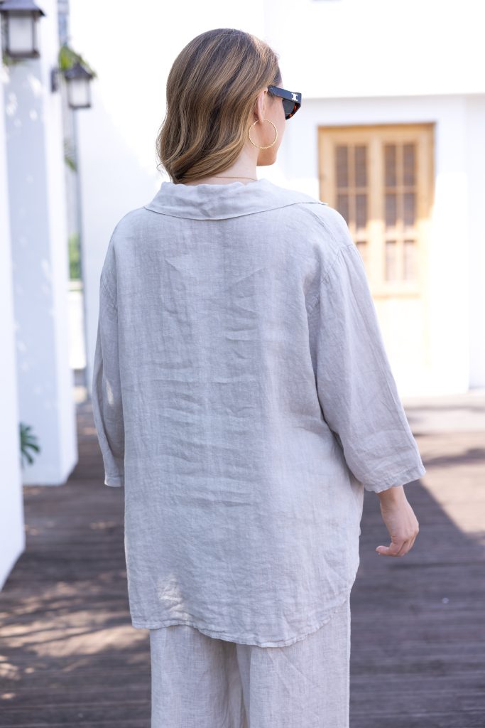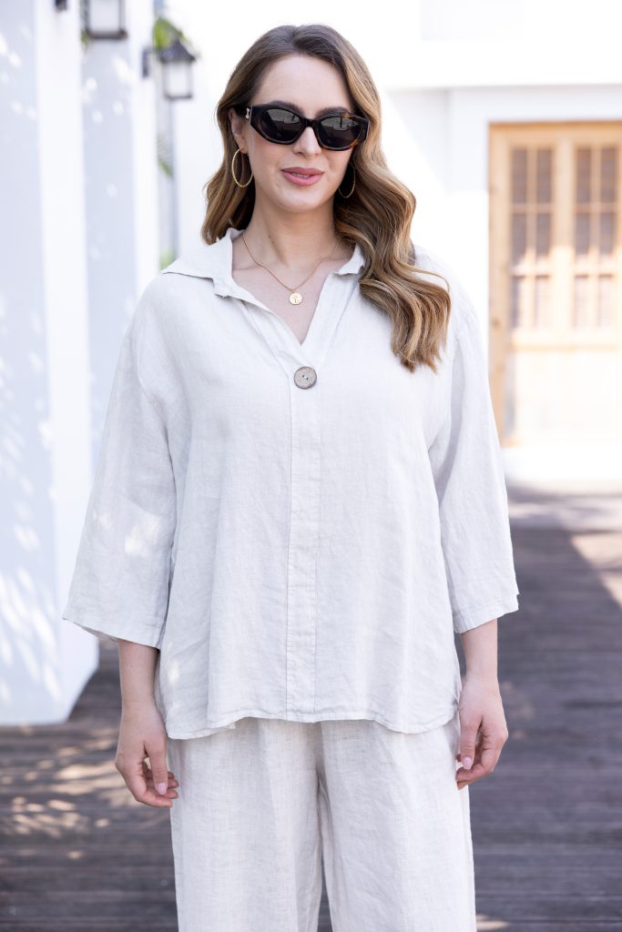 Classic and understated, Faye’s Button Top features a crisp collar, 3/4 sleeves, and a single button closure for a clean, elegant look. Its minimalist design makes it a versatile wardrobe staple, perfect for layering or wearing on its own for both casual and polished outfits.