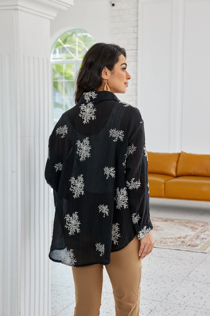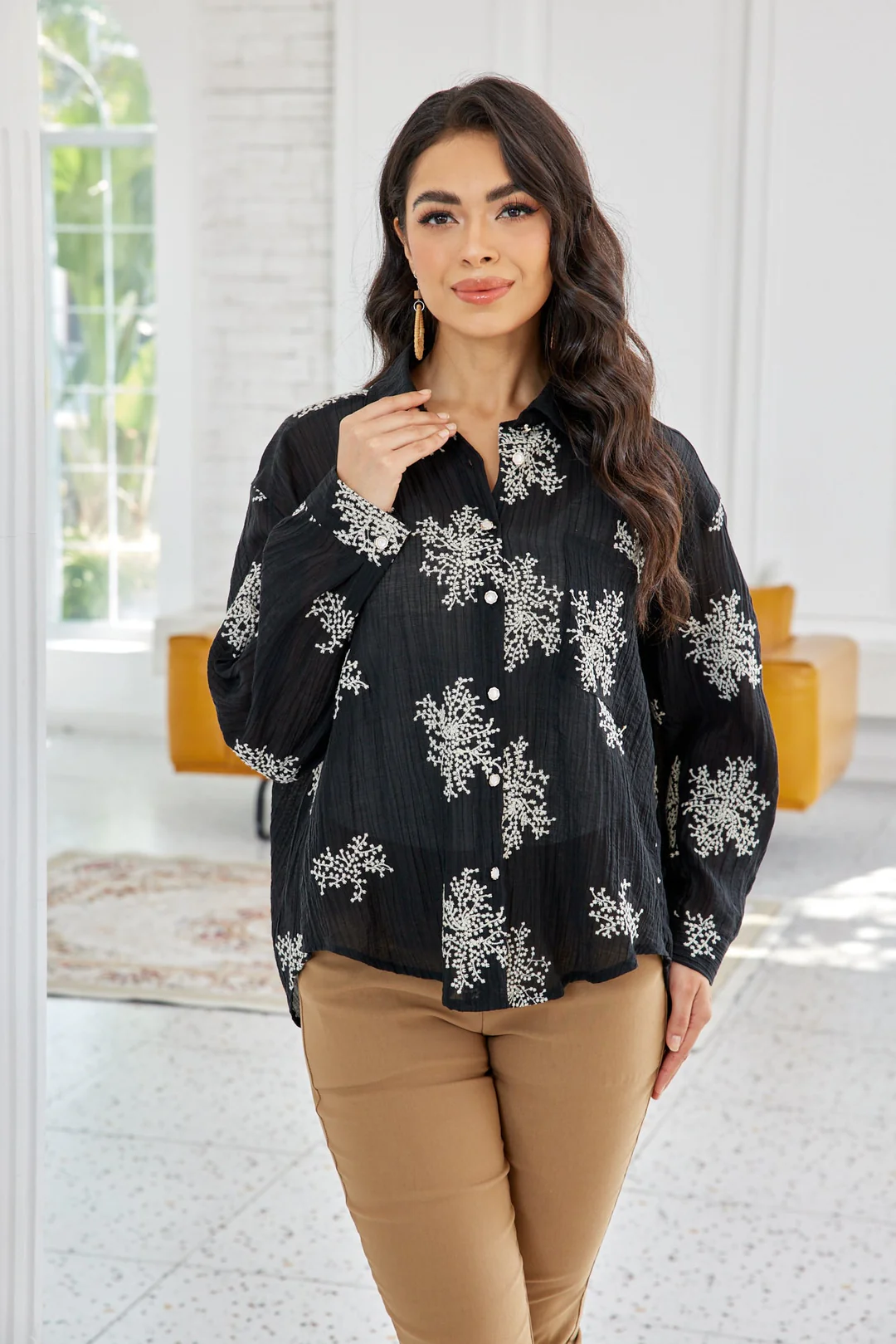 The Veiled Branch Top features delicate branch embroidery across translucent fabric, creating a subtle, nature-inspired texture. The short sleeves and button-down front add structure and versatility, while the lightweight, airy material gives a breezy, sophisticated feel.