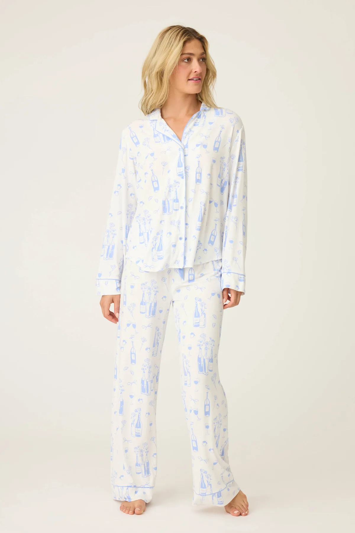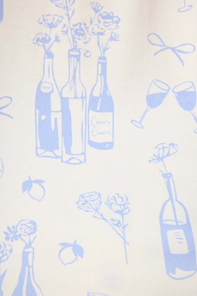This classic button-down shirt and matching pants set is straight out of a Parisian dream—decked in a toile-inspired print that mixes delicate florals, fresh lemons, and clinking wine bottles a.k.a your dream Eiffel Tower picnic in lounge form. Made from soft modal jersey, the shirt has a notch collar, blue buttons, and refined piping along the cuffs and placket, while the pants feature an elasticized waist with a blue drawstring and classic piping at the hem for a polished finish. Pair with the matching tank or shorts for a fresh, coordinated look on relaxed days or cozy evenings at home.