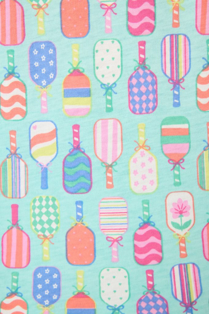 Game on, then kick back. This short pajama set features a playful pickleball paddle print scattered across a fresh oasis-blue backdrop. The short-sleeve button-front top is finished with contrast piping and a chest pocket, paired with matching shorts featuring piping and an elastic waistband with an adjustable drawstring for post-match lounging, late nights, and slow mornings.