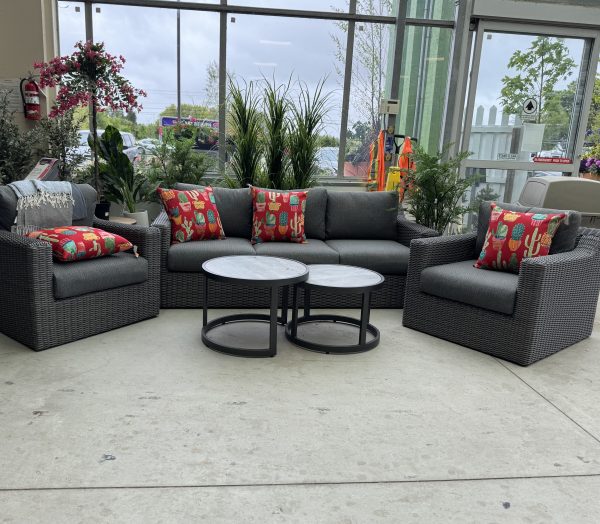 Decorate your outdoor space whether backyard or patio with the Pacific 5-Piece Outdoor Wicker Patio Set, where comfort meets classic styling. This 5pc set includes a 3-seat sofa, 2 large armchairs, and 2 nesting coffee tables—perfect for relaxing, entertaining, or enjoying your morning coffee outdoors.
