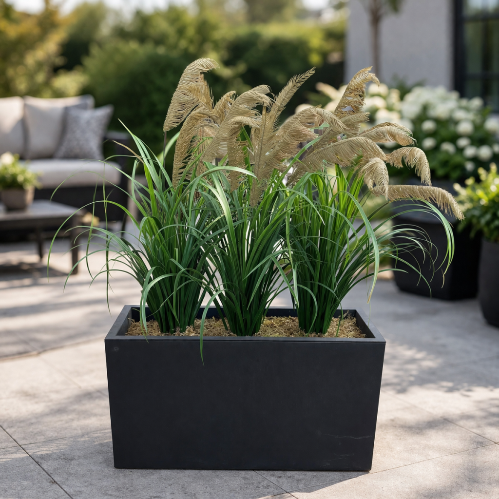The sleek black trough planter measures 17 inches long and is made from recycled tires, combining durability with an eco-friendly design. Its minimalist rectangular shape allows the natural texture of the pampas grass to stand out while complementing a wide range of modern and natural décor styles.