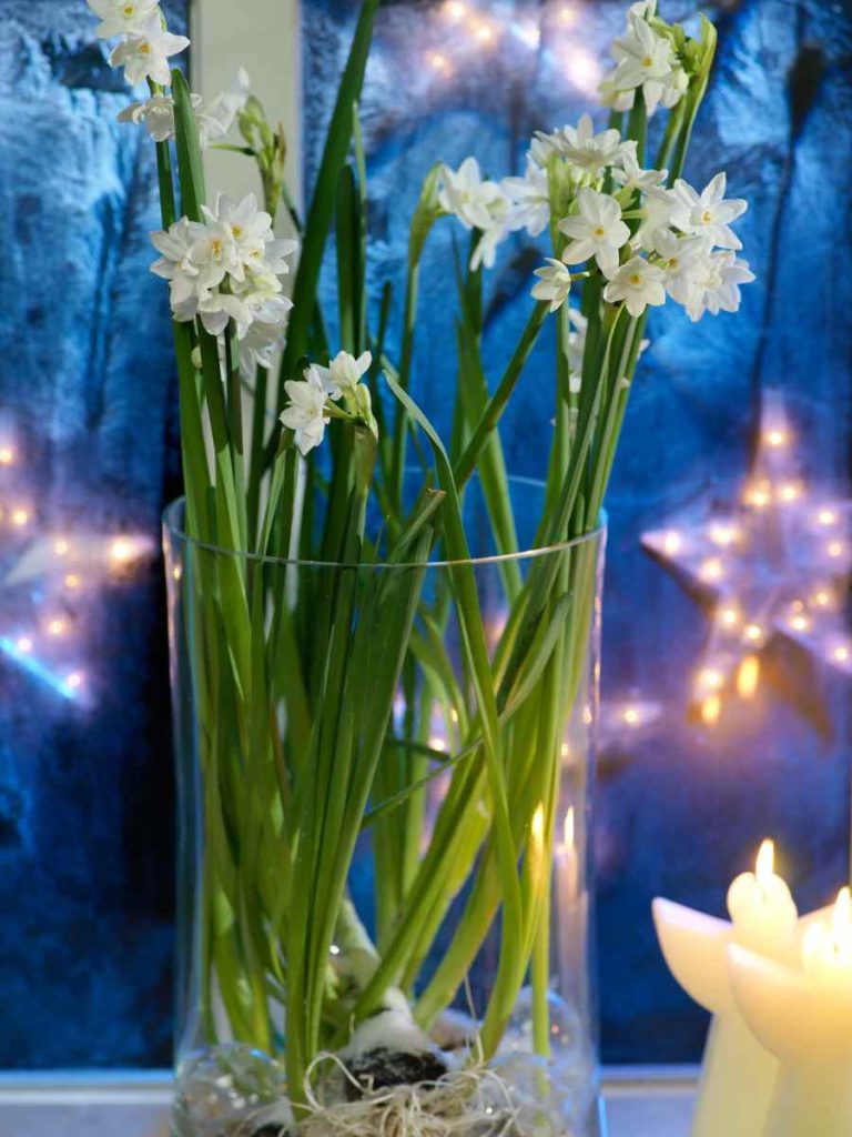 Paperwhite bulbs are easy to grow indoors and offer some colour during the winter months. Inbal produces white blooms on tall stems and can be grown with or without soil – unscented.