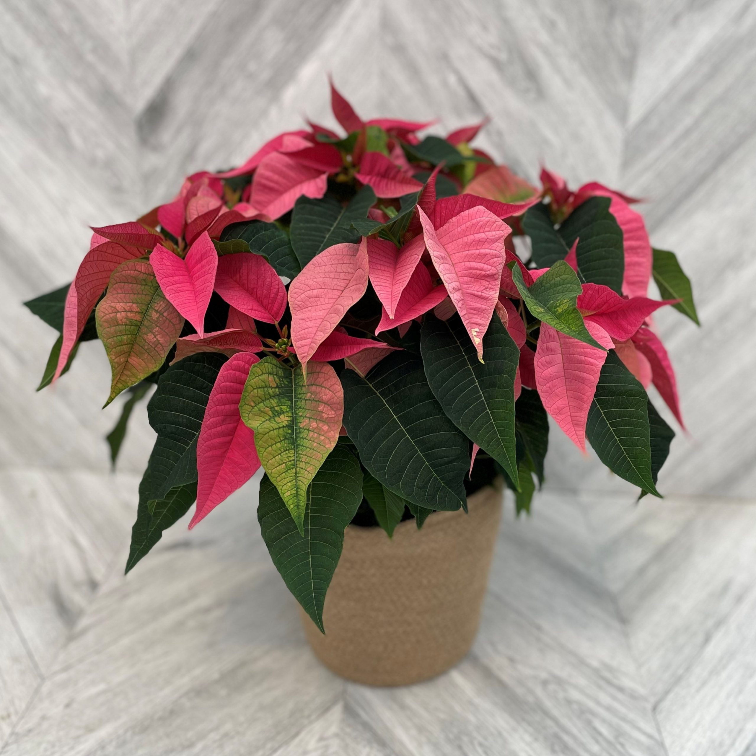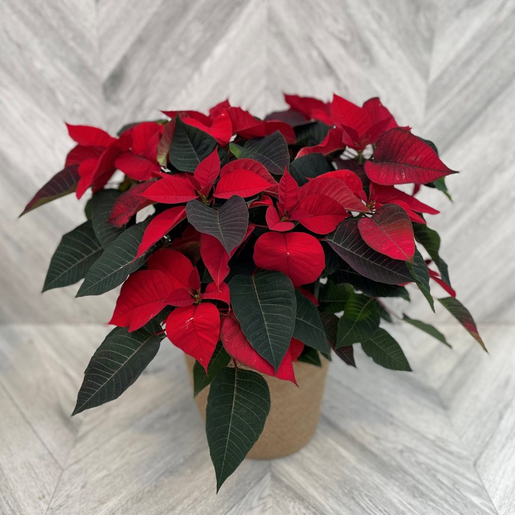 This 8-inch poinsettia, presented in a charming natural-colored woven basket, brings a touch of festive warmth and elegance to any space. The rich, velvety petals of the poinsettia are a stunning deep red, creating a striking contrast against the earthy tones of the basket. The lush, vibrant blooms are complemented by green leaves, offering a perfect balance of color and texture. Ideal for holiday décor or as a thoughtful gift, this poinsettia adds a natural, rustic charm while celebrating the season’s beauty. The woven basket provides a simple, timeless backdrop that enhances the plant’s vibrant display, making it a versatile and eye-catching addition to any home or office.