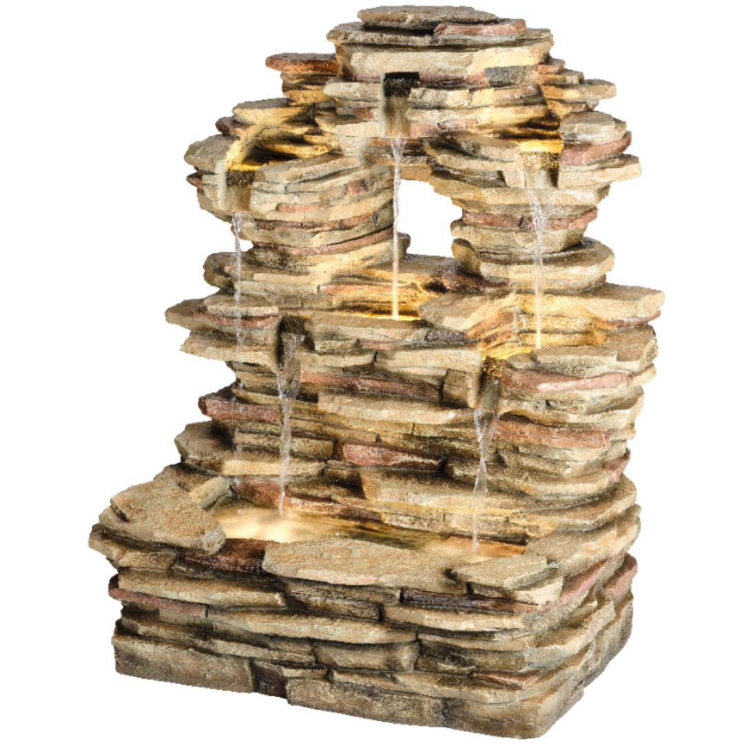 The Roca Outdoor Fountain has a beautiful stacked stone look, with water cascading down creating a soothing waterfall effect. Accented with warm white LED lights and constructed with polyresin, this fountain is extremely light weight, and is made to last outdoors.