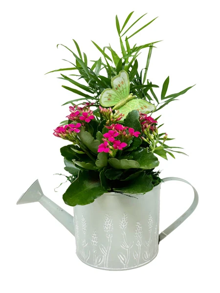 Add a charming garden-inspired touch to your décor with this delightful Watering Can Planter. Planted in a decorative metal watering can, this arrangement features a blooming kalanchoe paired with lush greenery and a whimsical butterfly accent, creating a cheerful display perfect for spring.