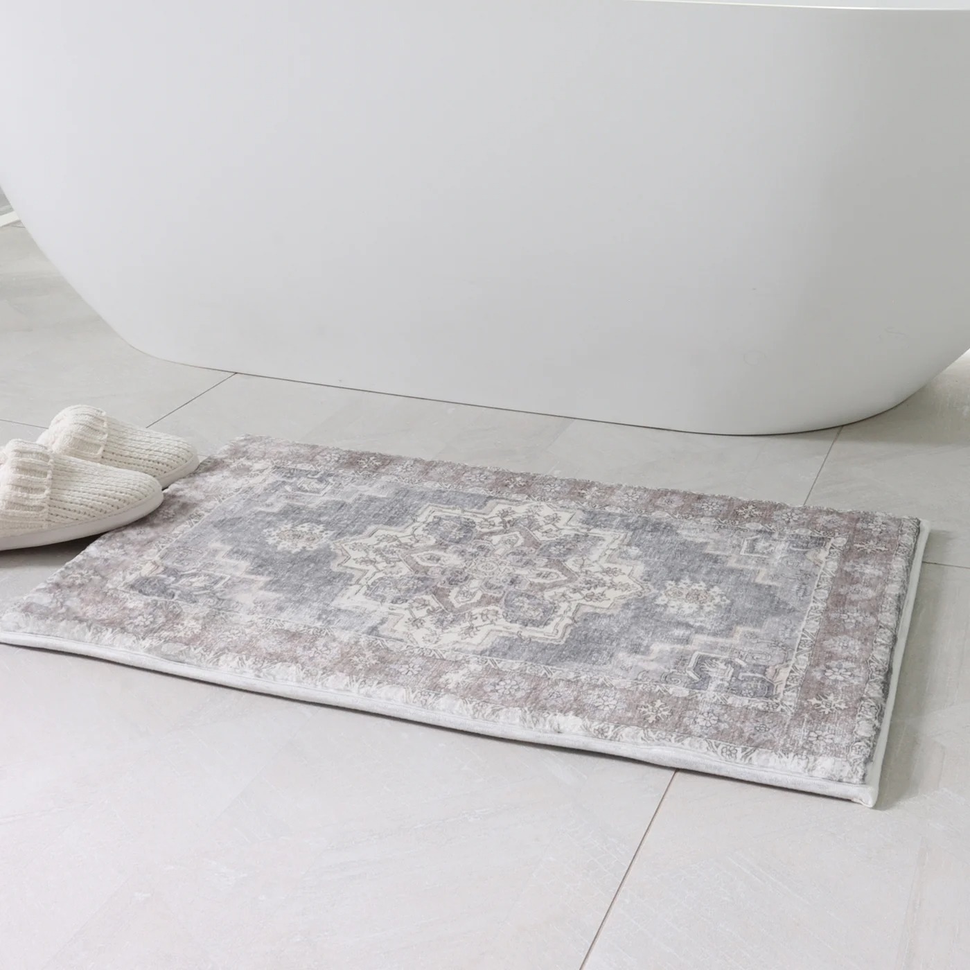 The Memory Foam Cilantro Bath Mat features a simple, modern design in neutral tones. Its plush, cushioned feel provides comfort and support underfoot, while adding a contemporary touch with a subtle rustic feel. Machine washable for easy care.