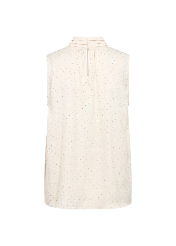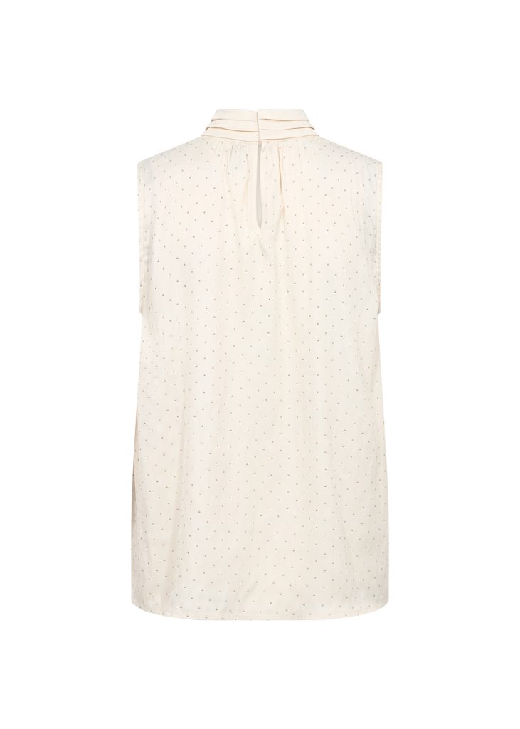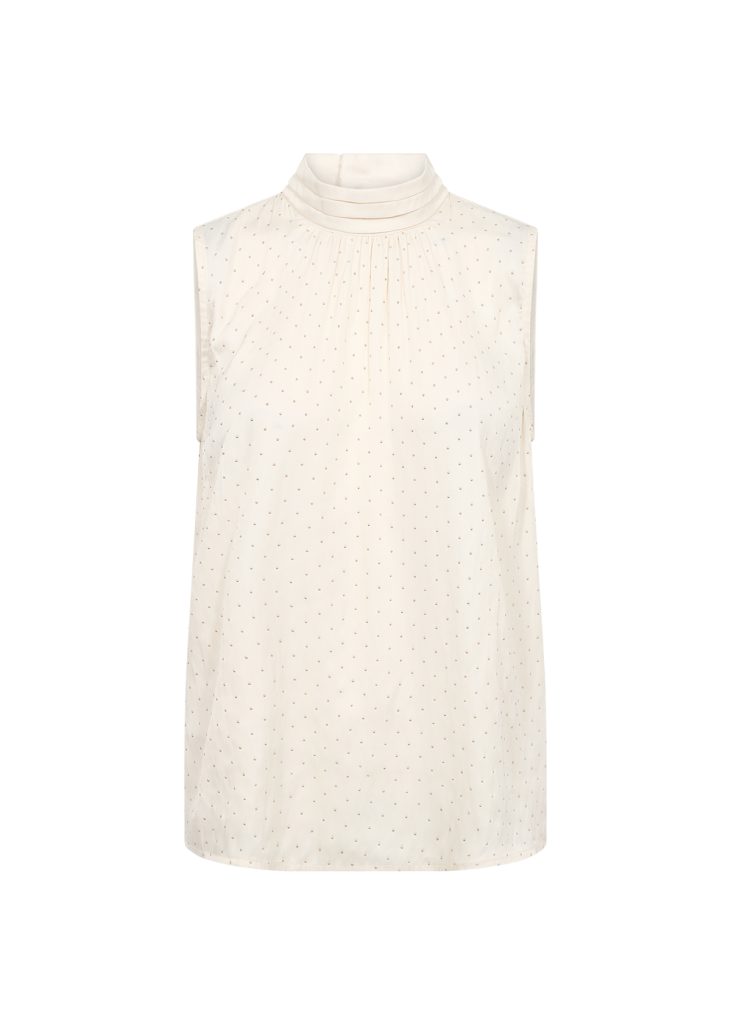 This elegant sleeveless top features a subtle polka dot pattern, pleated high neck, and relaxed fit. Wear it with tailored trousers or a flowing skirt for a refined look.