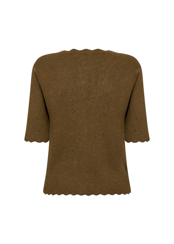It features short sleeves, a V-neckline, ribbed texture, and scalloped edges with button closures. Style it with jeans or a skirt for a classic look.