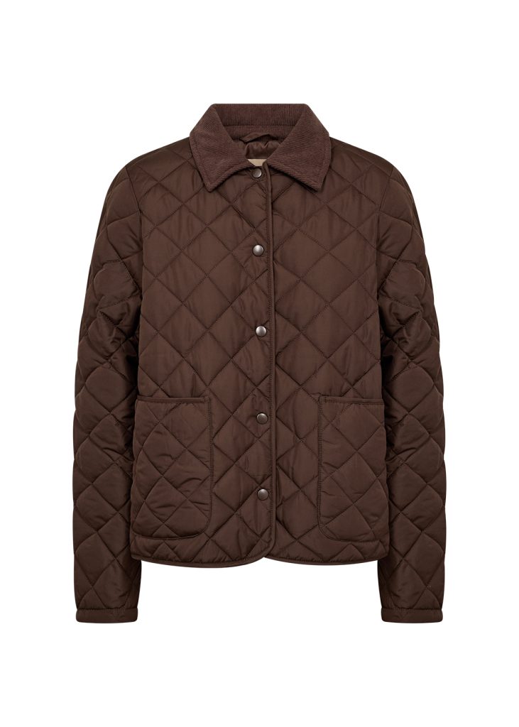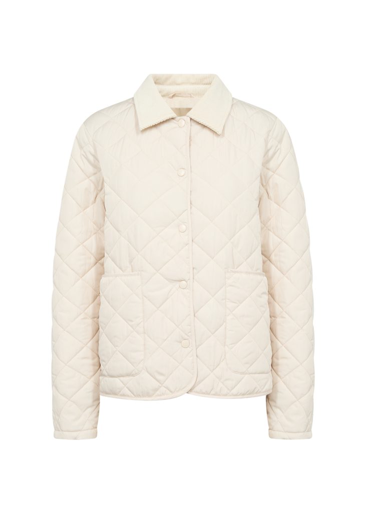 It features a corduroy collar, snap buttons, and a quilted texture with two front pockets. Pair it with jeans for a casual outing or layer over a dress for added warmth.