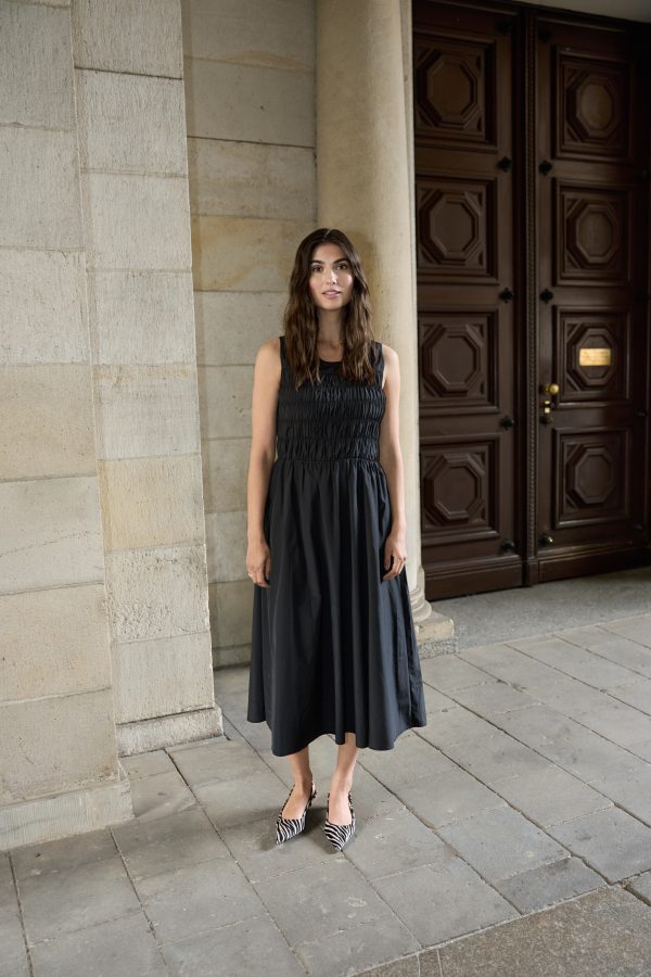 The dress features a sleeveless design with a gathered bodice and a flowing skirt that falls elegantly to a midi length. Pair it with simple sandals for a relaxed look or dress it up with statement accessories