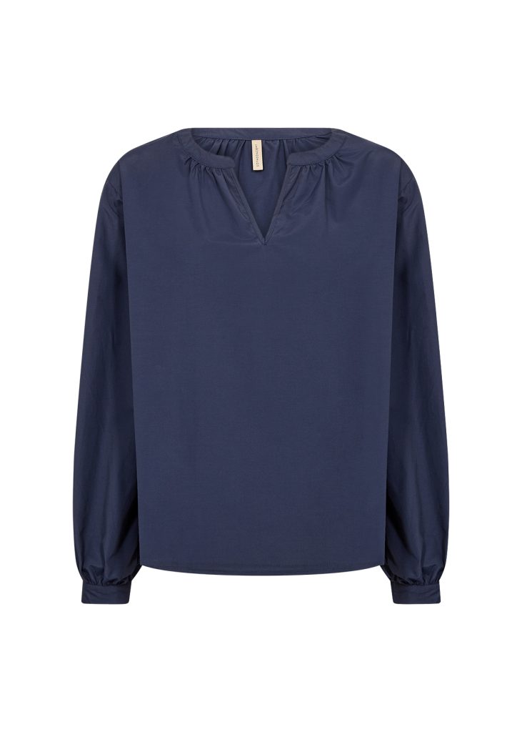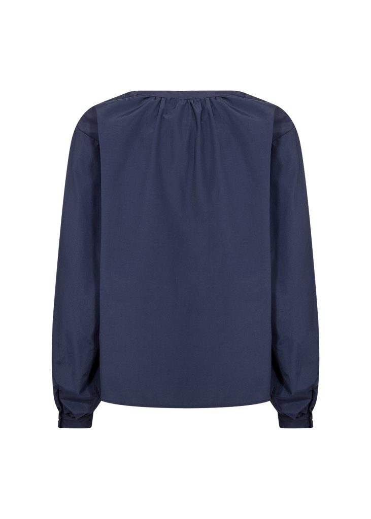 It features a relaxed fit with a V-neckline, subtle gathered details, and long sleeves with buttoned cuffs. Pair it with tailored trousers or jeans for a cool, modern look.