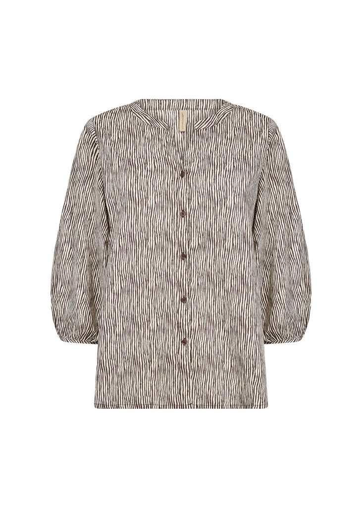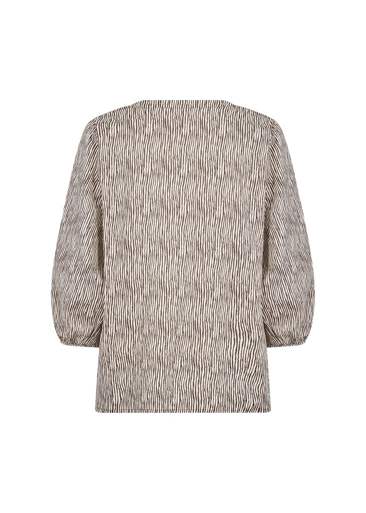 It features a round neckline, front button closure, and a textured stripe print with three-quarter sleeves. Pair it with jeans or a skirt for a casual look.