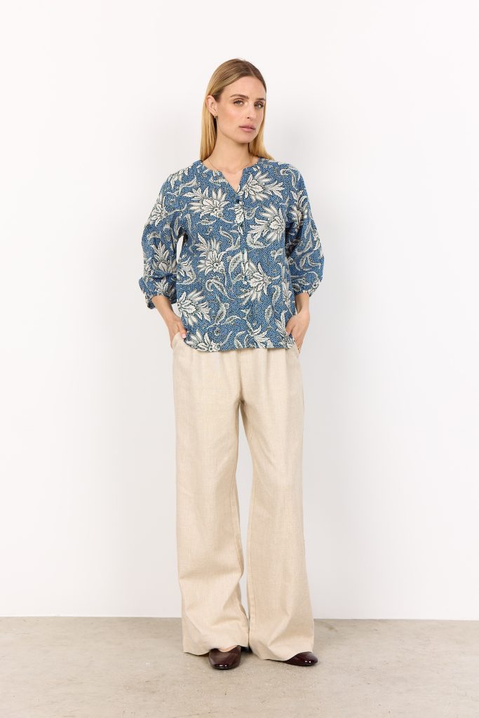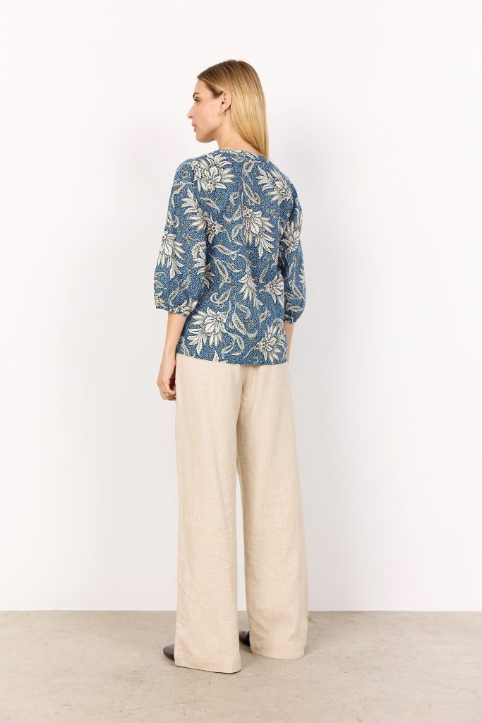 It features a relaxed fit with three-quarter sleeves and a delicate, button closure, and all-over floral print. Pair it with neutral trousers or denim for a comfortable and stylish look.