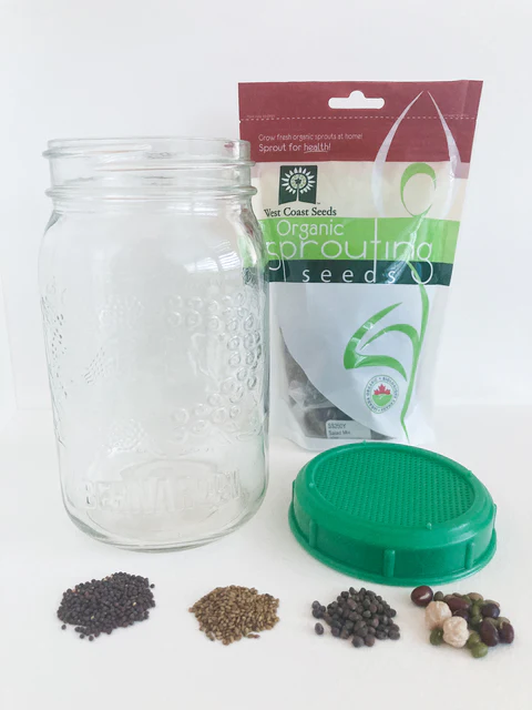 Here’s a great gift idea, or a fantastic introduction to sprouting at home. This kit contains a wide mouth mason jar, plastic sprouting screen (HG981), along with an instruction brochure and the Fantastic Four Seed Collection (SS200R). Bring a friend into the sprouting family with the gift of mild fantastic, fresh, easy to grow sprouts. The Sprouting Jar with Plastic Lid and Seed is basically a wide mouth mason jar with a screw-on (non-BPA) plastic sprouting screen lid, and a selection of the best sprouting seeds for beginners. Instructions are included on how to produce fresh, nutritious sprouts from seed to harvest in only four days.