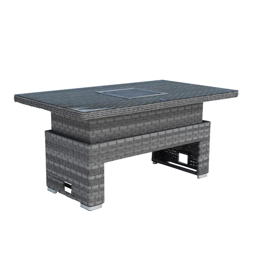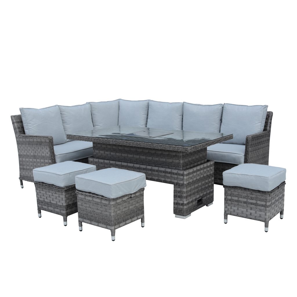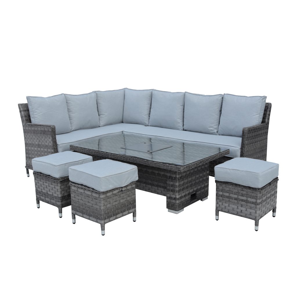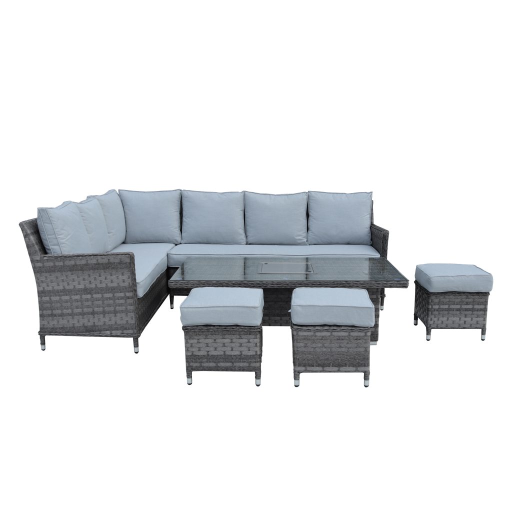 Elevate your everyday with the St Luc Convertible Corner Sectional a modern grey/beige wicker convertible dinette set with plush light-grey cushions, a roomy L-shaped sofa, sleek glass-top table, and three matching cushioned stools —perfect for comfortable outdoor lounging and entertaining. Featuring table that converts to a dining or a large coffee table.