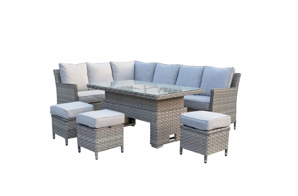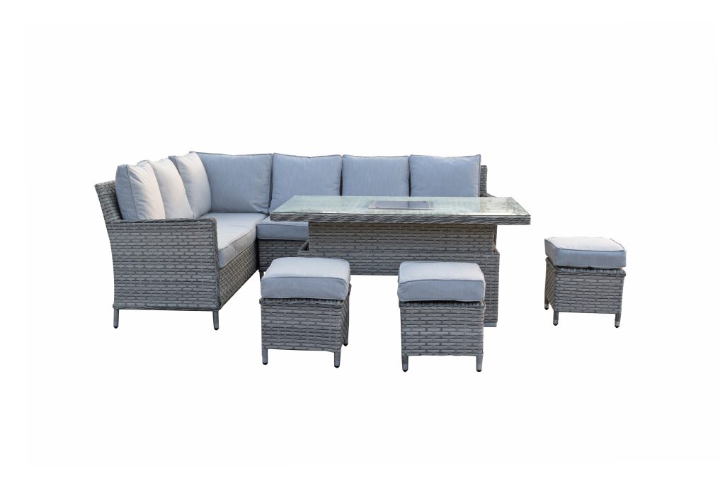Experience the St Nevis 6pc Convertible Corner Sectional a modern grey/beige wicker convertible dinette set with plush light-grey cushions, a roomy L-shaped sofa, sleek glass-top table, and three matching cushioned stools—perfect for comfortable outdoor lounging and entertaining. Featuring table that converts to a dining or a large coffee table.