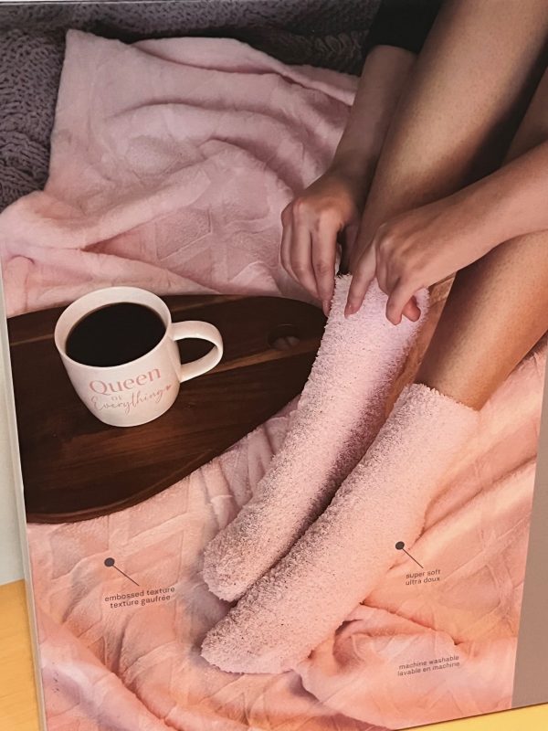 Includes: 1 blanket, 1 pair of fuzzy socks, 1 ceramic mug