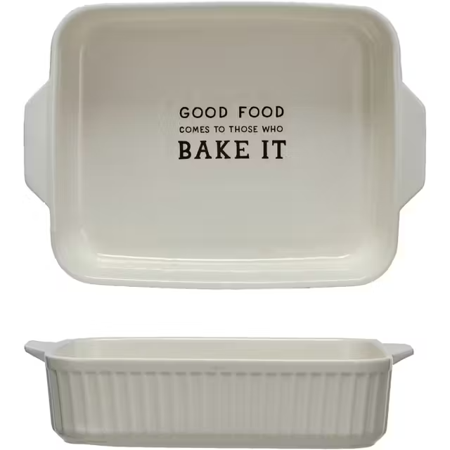 This Stoneware Baker, is a testament to both form and function. Its pristine white surface is adorned with the playful phrase “Good Food Comes To Those Who Bake It,” making it a source of motivation in any kitchen. The baker’s classic shape and robust material make it a reliable choice for all baking needs, while its simple elegance ensures it will fit seamlessly into eclectic, farmhouse, or French country decor. Whether it’s used for a family meal or a gathering of friends, this stoneware baker is sure to be the centrepiece of delicious memories.