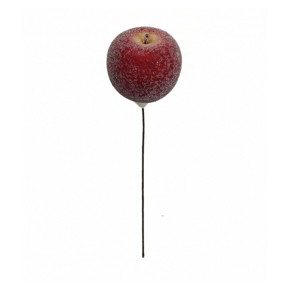 A classic addition to holiday decorating, this sugared red apple is lifesize and on a wire pick. Water and weather resistant. 80mm diameter