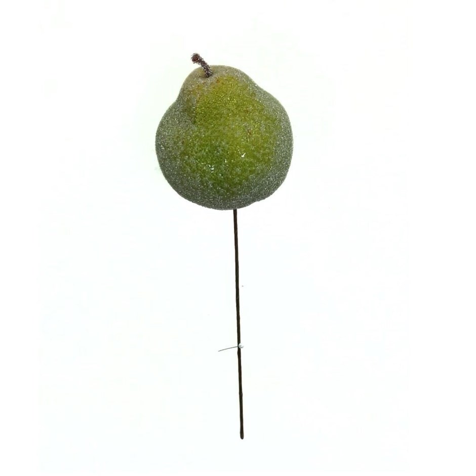 A classic addition to holiday decorating, this sugared green pear is lifesize and on a wire pick. Water and weather resistant. 80mm diameter
