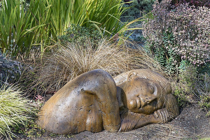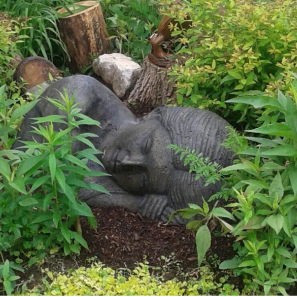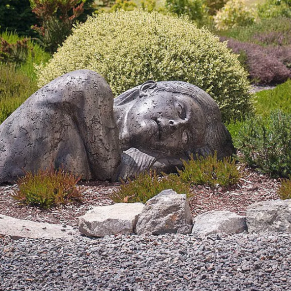 This large Terra Dormis “Sleeping Earth” or “Earth Asleep” Garden Statue is made of a concrete blend that is durable, lighter than regular concrete, weather worthy and built to withstand cold Canadian winters.