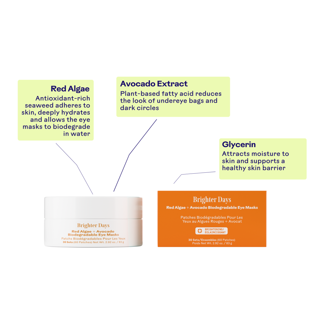 Brighter Days Eye Masks are biodegradable and help visibly depuff, brighten and hydrate the delicate under eye area, leaving you looking refreshed and energized.