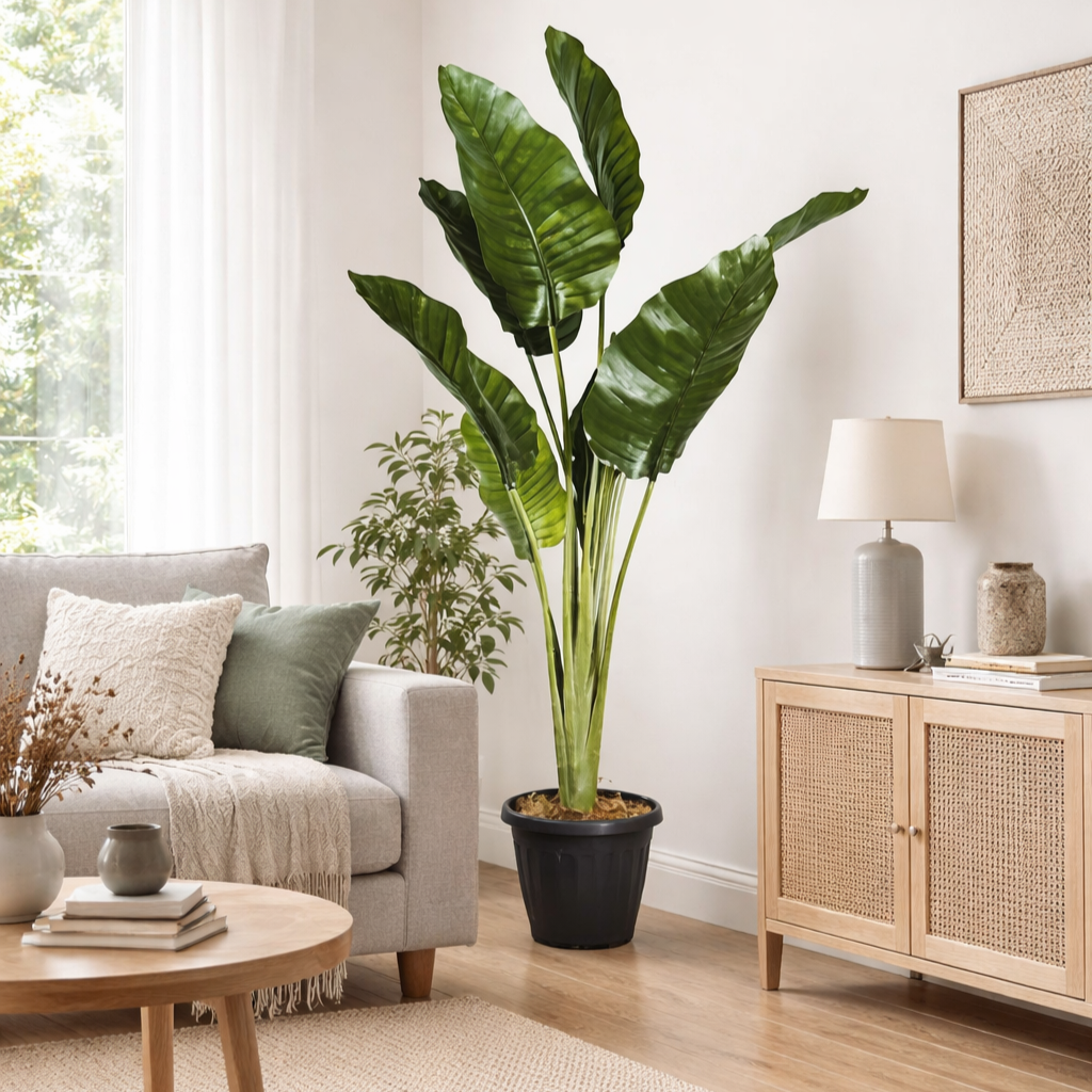 | Standing 5 feet tall, this artificial Traveler’s Palm is the perfect trendy addition to any room. With its tall stems and large, vibrant green leaves, it effortlessly breathes life into your space, filling the room beautifully. Timeless in style, it complements any design with ease.