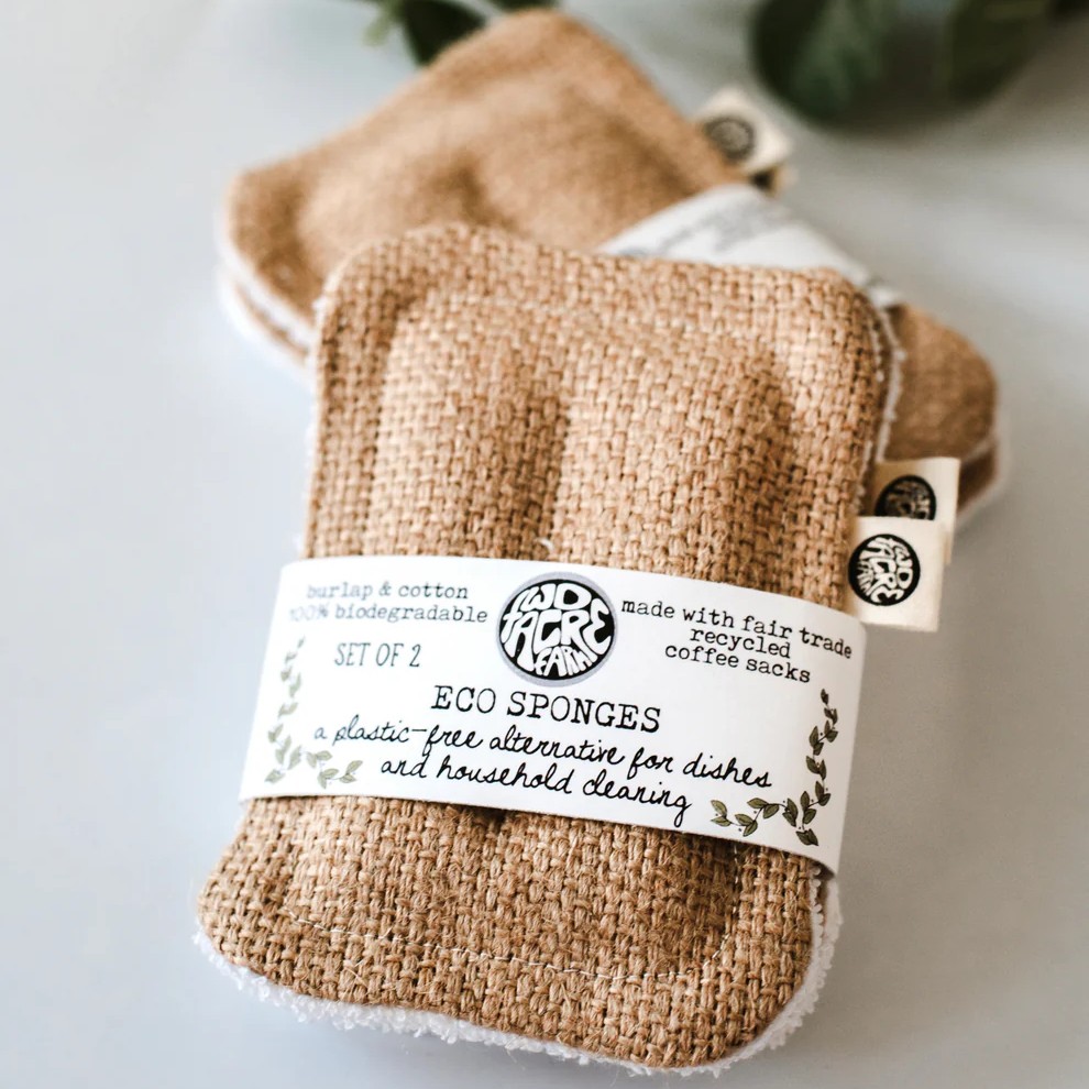 Eco sponges are 100% compostable, and are perfect for a zero waste kitchen as they are completely plastic free. The eco sponges have 8 layers, and are made solely from cotton and burlap. These sponges have a burlap backing for scrubbing tough to clean pots and pans. The burlap is recycled from fair trade coffee sacks that we source from local coffee roasters. Burlap scrubs efficiently, but does not damage surfaces. The other side of the sponge is made from cotton terry toweling. The sponge is stuffed with more terry toweling and absorbent cotton batting. Unlike cheap plastic sponges, which need to replaced regularly as they become unhygienic rather quickly, these eco sponges can be put in the dish washer or washing machine with your kitchen towels!