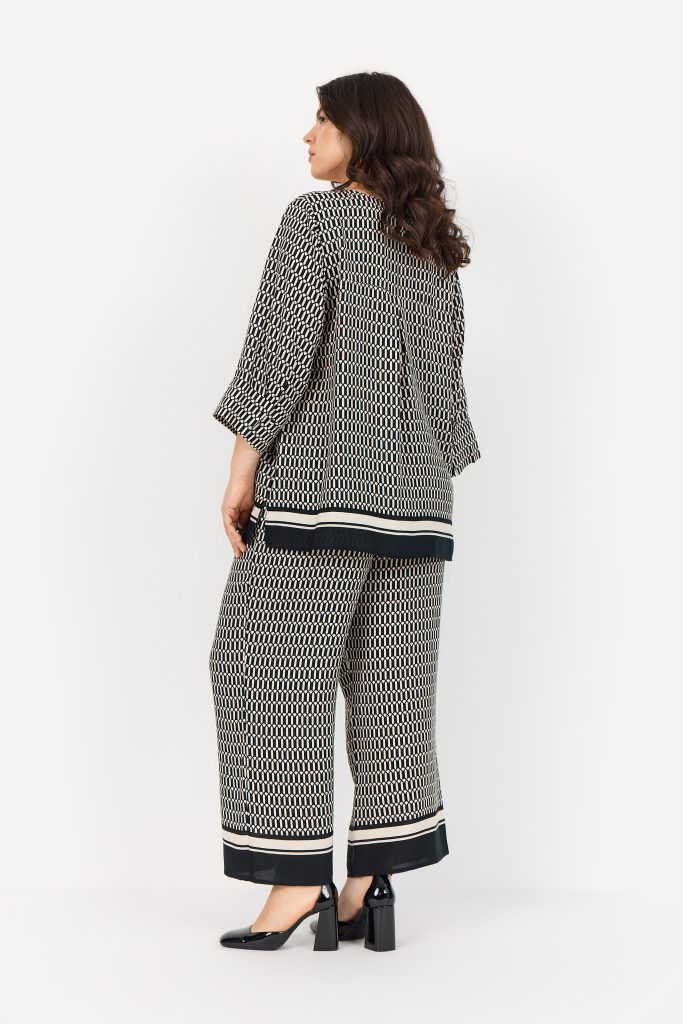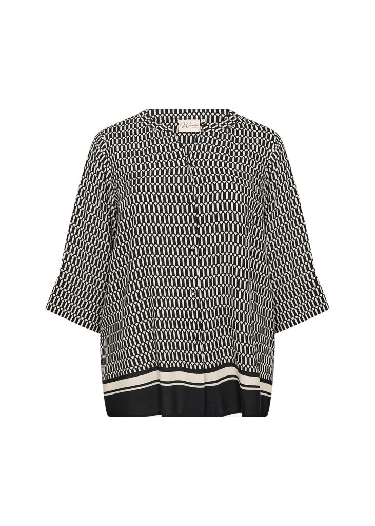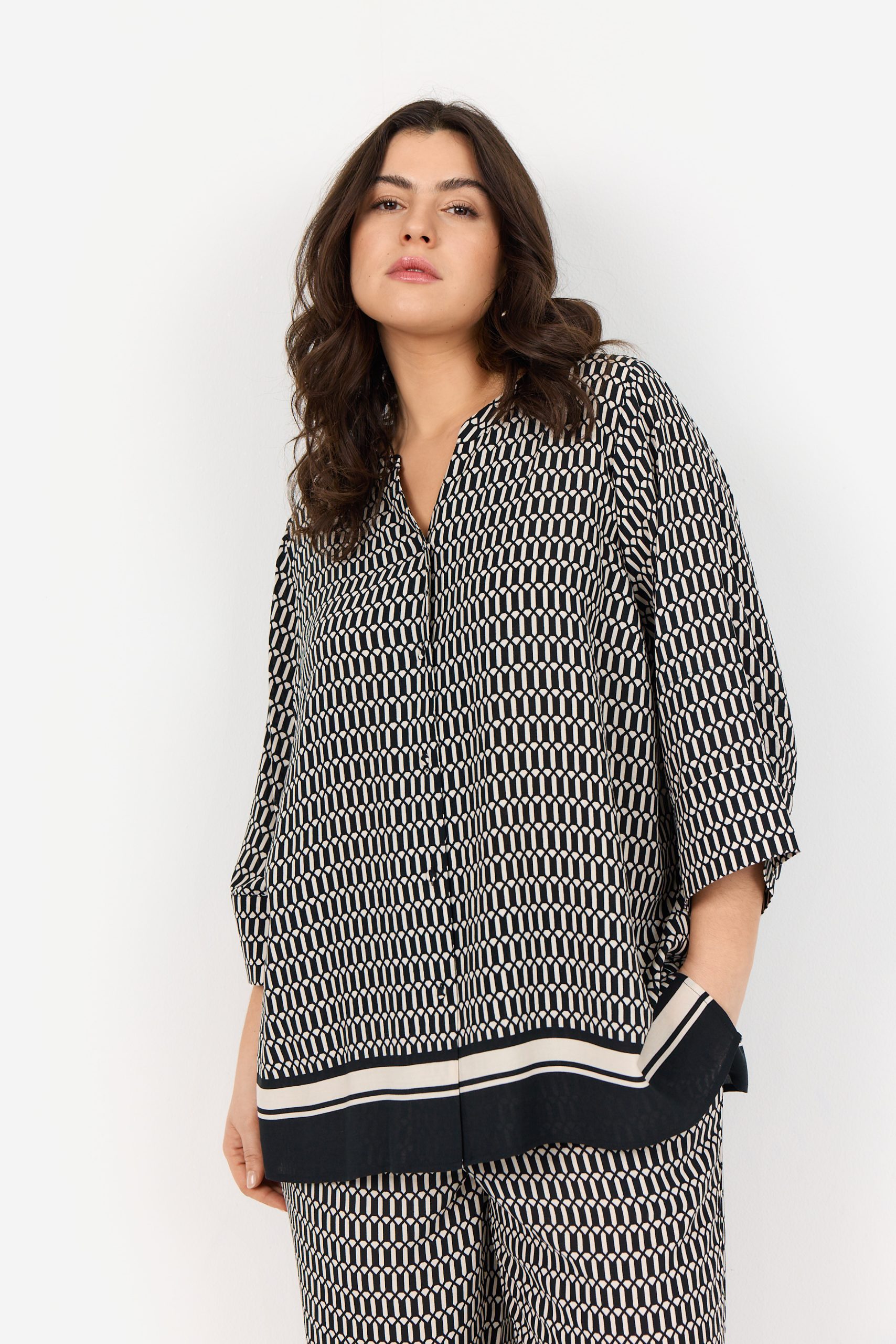 This shirt features a sleek v-neck, subtle button fastening, and mid-length cut with an eye-catching geometric print. Pair it with tailored trousers or casual jeans for a smart and stylish look.