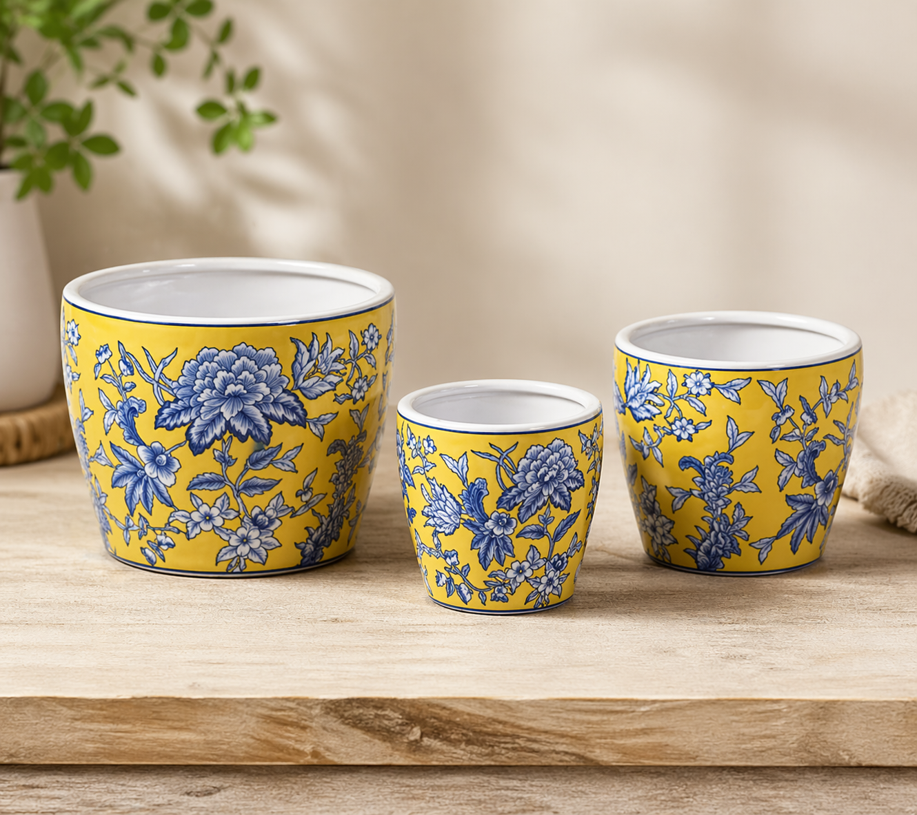 Add a vibrant touch to your space with these stunning ceramic pots featuring an eye-catching blue floral pattern set against a rich yellow background. Inspired by timeless botanical designs, these decorative planters bring warmth, colour, and elegance to shelves, tabletops, and plant displays. Perfect for showcasing houseplants, succulents, or floral arrangements, these pots make a beautiful statement in any indoor setting.
