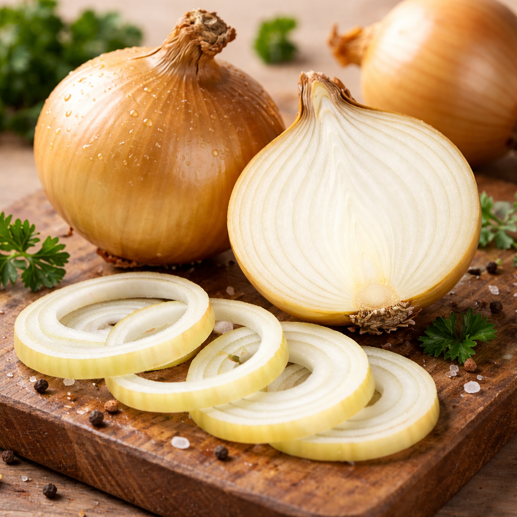 A yellow Spanish onion is a large, round onion with golden-brown papery skin and crisp white flesh. It has a balanced, mildly sweet flavor that becomes rich and savory when cooked, making it ideal for sautéing, caramelizing, and everyday cooking.