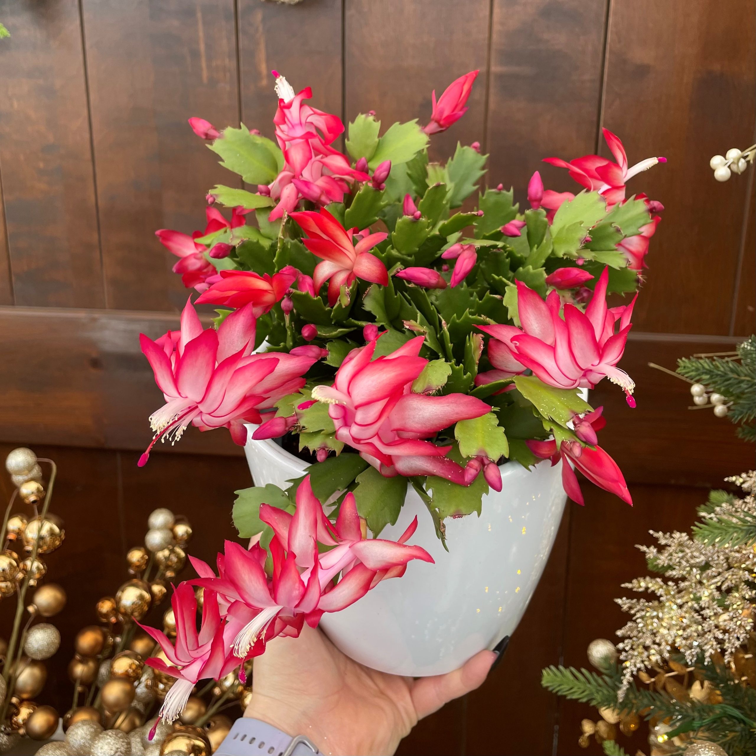 This 6-inch Zygo Cactus, with its vibrant, segmented stems and bold, vibrant blooms, adds a touch of desert charm to any space. Potted in a sleek ceramic pot, the minimalist design of the container beautifully complements the cactus’s natural beauty, allowing its colorful blossoms and sculptural shape to take center stage. Perfect for desktops, shelves, or windowsills, this low-maintenance cactus thrives in bright, indirect light and requires minimal care, making it a wonderful choice for busy plant lovers or anyone seeking a pop of color and texture in their home or office.
