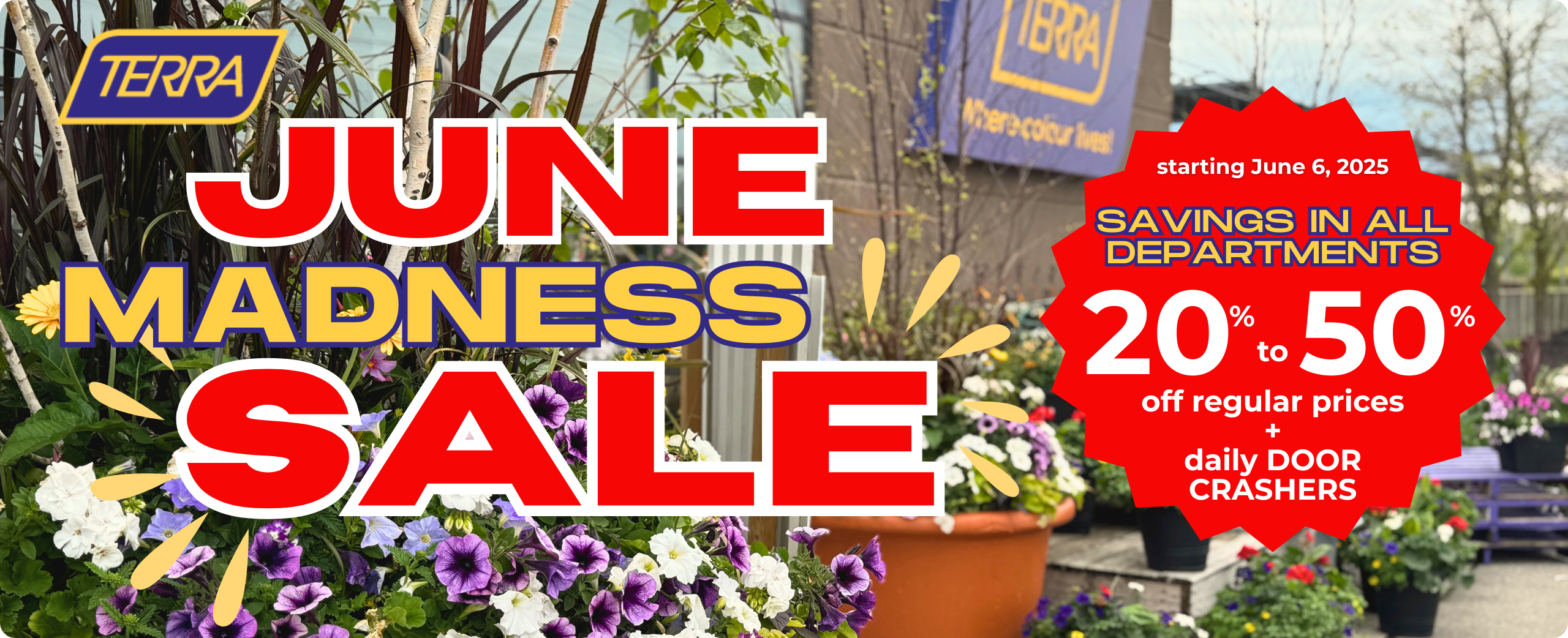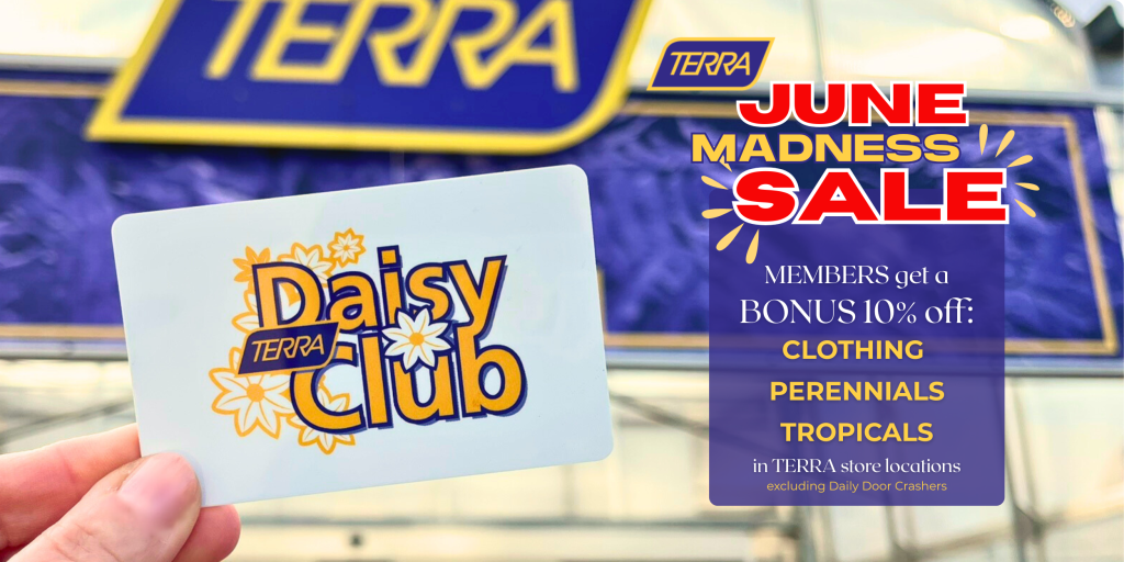 It's Summer MADNESS with storewide SAVINGS at TERRA! With discounts from 20% to 50% off in every department and daily door crashers, find hot deals and quality products in all locations. Daisy Club members can save even MORE with exclusive bonus discounts (like an extra 10% off our collection in The Kind Matter!)