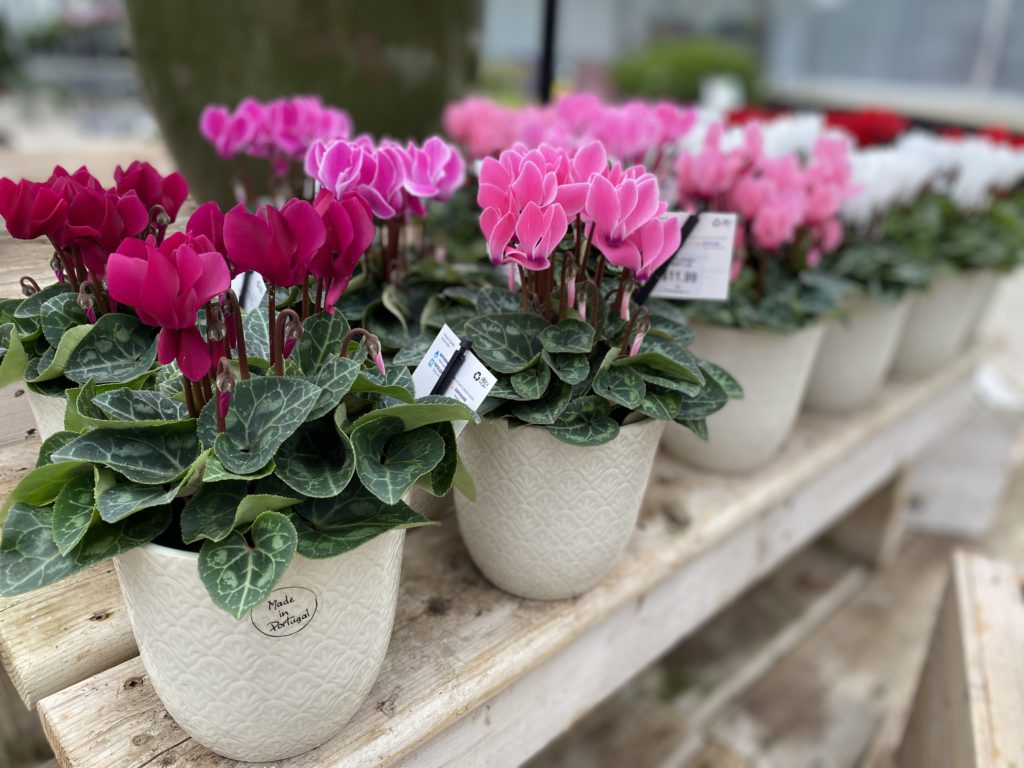 These charming plants offer bold clusters of blooms, held high like a crown above tidy little mounds of pretty, unique foliage. Cyclamen blooms for several weeks to months, given morning sun and a not-too-hot location. Place Cyclamen on kitchen counters and powder room windows, side tables, dressers, and shelves where they can be noticed and enjoyed up close. Try watering Cyclamen from the bottom – place the grower pot into a dish or bowl of water, allowing a few minutes to saturate the soil without wetting the leaves, and then allow it to drain and dry completely before watering again. Feed Cyclamen every 3-4 weeks while in bloom by adding a liquid plant food to water.